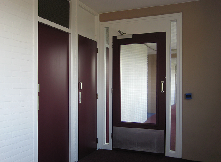 Voor de muren en de kozijnen is gekozen voor een lichte, neutrale wittint. De woningdeuren hebben een paarsrode kleur gekregen. Deze komt overeen met de paarsrode kleur van de vloerbedekking. De functionele deuren hebben dezelfde kleur, maar dan in een donkerder variant omdat de functionele deuren snel vervuilen. De toog bij de woningdeuren heeft een taupekleur gekregen. Doordat deze kleur vrij licht is krijgt de toog een accent ten opzichte van de muren, zonder dat hij te sterk aanwezig is.