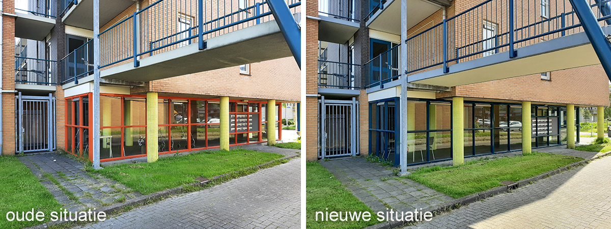 In de oude situatie hadden de hekwerken een mooie blauwgroene kleur. Deze kleur is in de nieuwe situatie verder doorgetrokken. Naar de kozijnen van de entrees en trappenhuizen.
